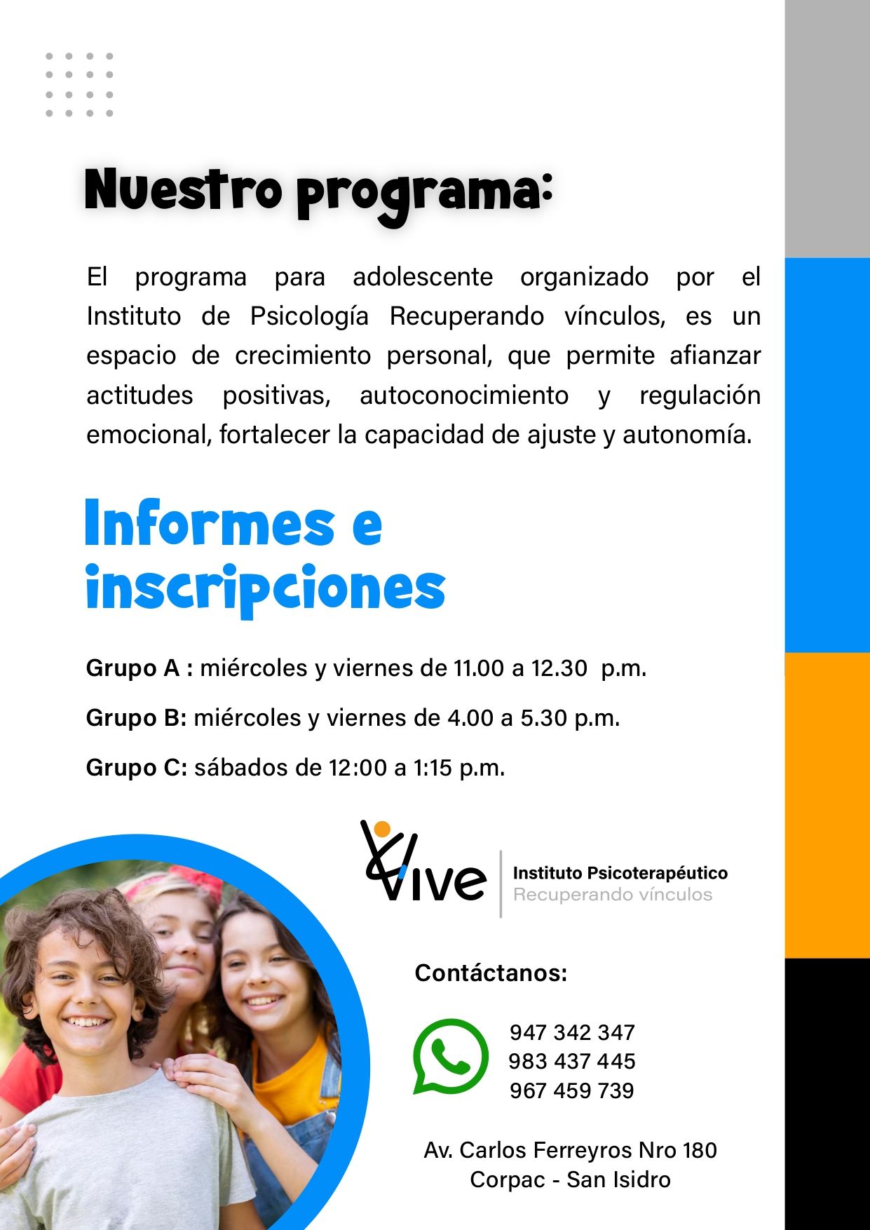 En nuestro instituto brindamos psicoterapia individual, familiar y de pareja, talleres vivenciales, grupos de encuentro, programas especializados de la problemática infantil y adolescente, programas de desarrollo personal y coaching para organizaciones. La relación con la comunidad es de compromiso humano y responsabilidad.